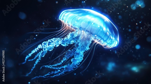 A jellyfish with glowing tentacles drifting through the dark ocean, creating a mesmerizing underwater scene.