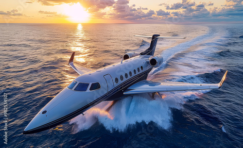 A jet plane is flying over the ocean with the sun setting in the background. The plane is leaving a large wake behind it
