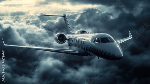 A jet plane is flying through a stormy sky. The clouds are dark and ominous, and the plane is the only thing visible in the scene. Scene is tense and foreboding