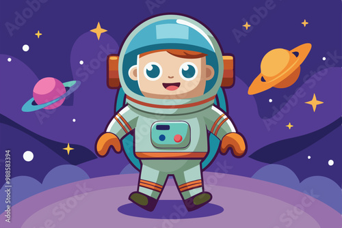 A joyful astronaut character stands amidst colorful planets and stars, embracing the wonders of space exploration, a cartoon character of a Astronaut cartoon
