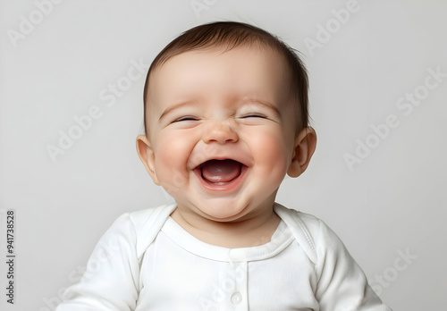 A joyful baby smiling brightly, capturing pure happiness and innocence in a light-colored onesie against a neutral background.
