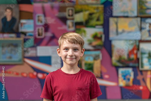 A joyful boy in an art gallery smiles and poses against a background of paintings in the exhibition hall.