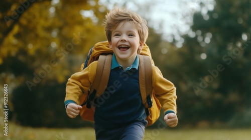 A joyful child dashes through a park wearing a school uniform and carrying a rucksack