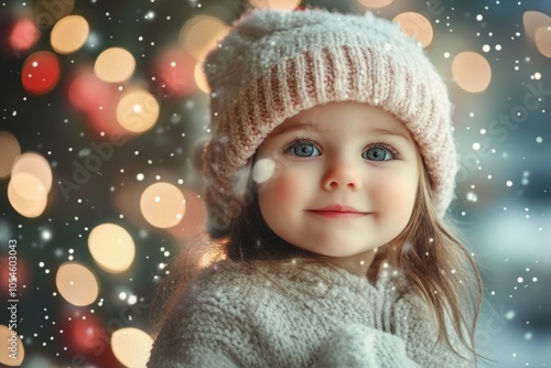 A joyful child in a cozy sweater and hat smiles against a backdrop of twinkling lights during a snowy Christmas celebration