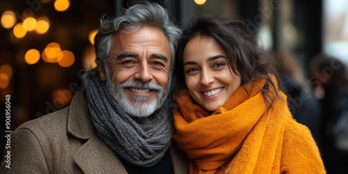 A joyful couple stands together, wrapped in scarves, smiling warmly in a café