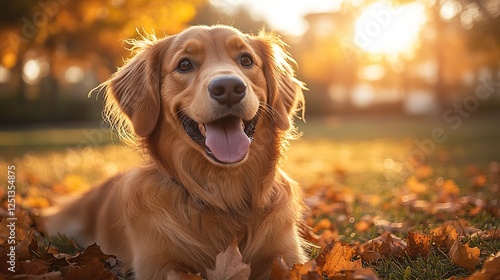 A joyful dog on a leash strolling in a park with autumn leaves and sunshine in the background.