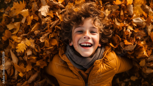 A joyful European boy plays amidst a vibrant carpet of autumn leaves, his laughter resonates.