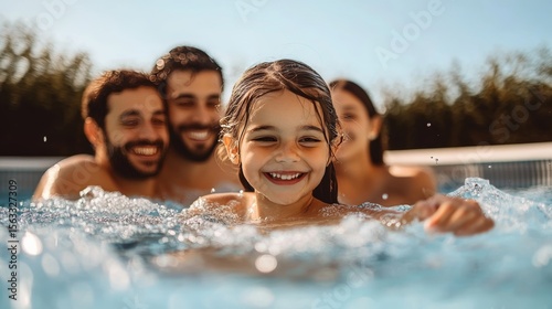 A joyful family having fun together, splashing in the outdoor swimming pool on a sunny summer day