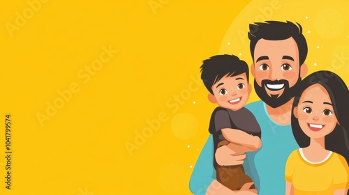 A joyful family of three smiles brightly together, radiating happiness on a cheerful yellow backdrop that emphasizes their bond. Generative AI