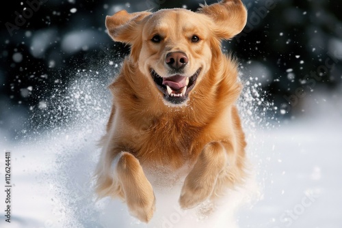 A joyful golden retriever running through snow