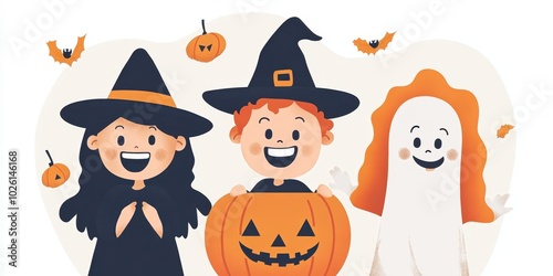 A joyful Halloween scene with children dressed in costumes, featuring a pumpkin and playful decorations.