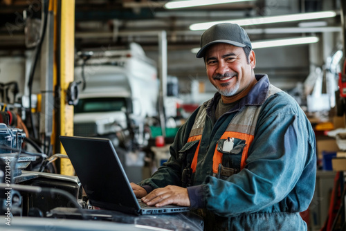 A joyful Hispanic mechanic, in work gear, operates a laptop while standing next to a truck in a bustling repair shop. The background shows a variety of tools, machinery, and a well-lit workshop space.