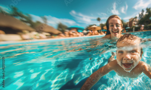 A joyful mother and her child swimming in a bright blue pool on a sunny day. The image captures their happiness and the vibrant atmosphere of the outdoor setting.