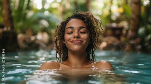 A joyful woman smiles radiantly while immersed in a lush spa environment, surrounded by nature, capturing the essence of tranquility and happiness in her serene moment.