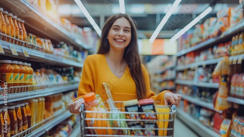A joyful young lady is happily shopping in a grocery store, pushing a cart through a supermarket aisle filled with various products. She is smiling while selecting vegetables, fruits, and beverages