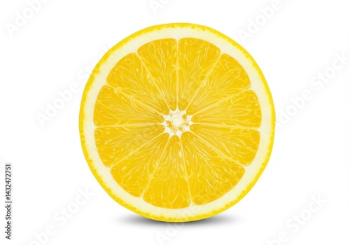A juicy lemon slice perfectly halved reveals its vibrant yellow segments and refreshing citrus heart against a bright white background