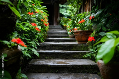 A jungle path lined with exotic plants and flowers, leading to an ancient temple overgrown with vines