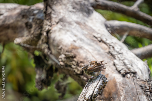 A juvenile Song Sparrow on an old rotten log at Oaks Bottom Wildlife Refuge in Portland Oregon
