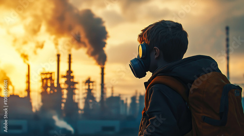 A kid boy wears a mask in a polluted city. The concept of urban environmental challenges, air quality, and protecting future generations. Generative AI.