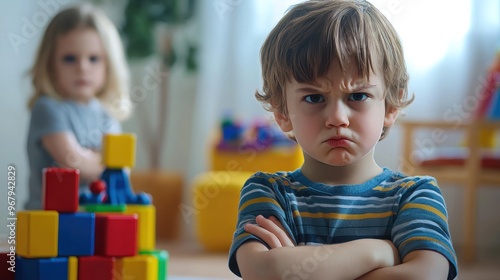 A kid watching a friend with a new toy, arms crossed, pouting.