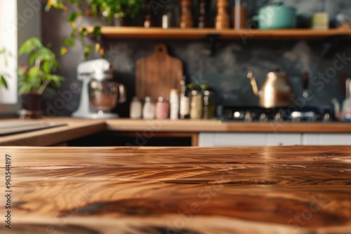 A kitchen counter with a wooden top and a potted plant on the left side. The counter is empty except for a few items such as a knife, a bowl, and a cup. The kitchen has a rustic and cozy feel to it
