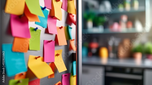 A kitchen scene featuring a refrigerator with a collage of bright sticky notes, bringing a cheerful and functional touch to the space