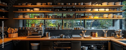 A kitchen with open shelving and minimal utensils, promoting efficiency