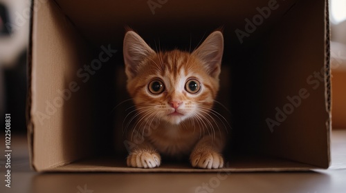A kitten sitting inside a cardboard box, looking out with wide, curious eyes as it plays in its new fort.