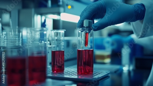 A laboratory technician in a white coat carefully transfers red liquid between test tubes while engaged in scientific research. The workspace is filled with precise instruments and glassware