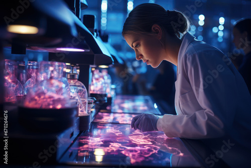 A laboratory technician inspecting cells under a microscope, exploring cellular biology. Concept of microscopy and biological research. Generative Ai.