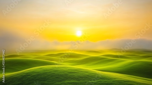 A landscape of rolling green hills under a bright yellow sky with a hazy horizon glow