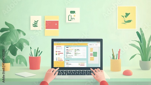 A laptop computer displaying a colorful interface on a light mint-green desk.