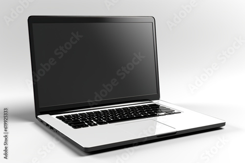 A laptop computer sitting on top of a table. Generative AI. Mockup with space for your design or logo.