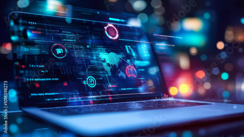 A laptop displaying complex digital data analytics in a vibrant urban environment at night showcasing technology and innovation