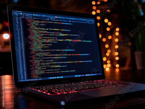 A laptop displays colorful code on its screen in a dimly lit room, creating a focused and professional atmosphere.