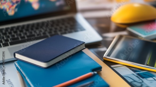A laptop, notebooks, a pen, and a phone lie on a wooden desk, suggesting a busy workspace.