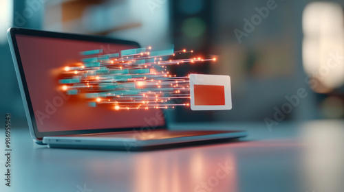 A laptop screen shows a red flash of light and a red flash drive, Concept of technology and the importance of data storage.