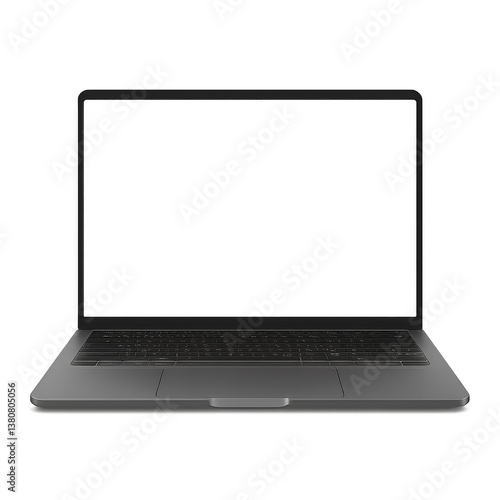 A laptop with a black keyboard and a white screen. The laptop is open and ready to be used. Isolated on transparent background