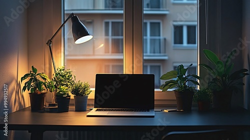 A laptop with a blank screen sits on a desk in front of a window with plants on either side, illuminated by a desk lamp.