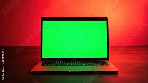 A laptop with a green screen against a red backdrop, ideal for digital content creation.