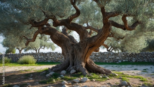 A large, ancient tree with twisting branches and a thick trunk, surrounded by a stone wall and grass, under a clear sky.