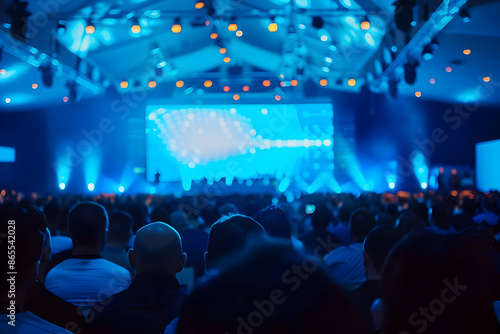 A large audience attending a blue-lit conference or event in a spacious venue with a focus on a big screen and stage setup.
