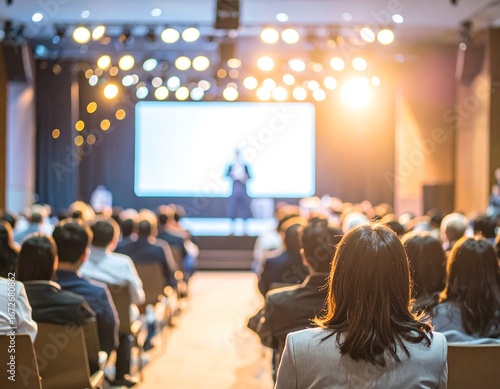 A large audience attentively listens to a speaker at a professional conference.