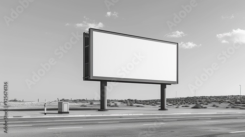 A large billboard is on a road in a desert. The billboard is white and has no writing on it. The scene is desolate and empty, with no other people or vehicles in sight