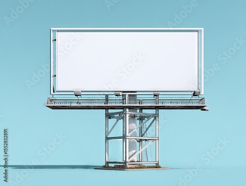 A large, blank billboard on a metallic, slightly weathered structure against a pale blue background. The billboard is rectangular and white, with a simple, industrial support system
