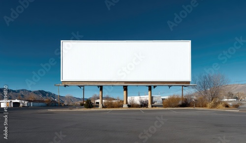 A large, blank billboard stands in a desolate, flat parking lot against a vibrant blue sky, with distant mountains and sparse, wintery vegetation visible