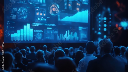 A large business conference where presentations are done through holographic displays, glowing charts, and digital documentation showcasing business strategies and innovations