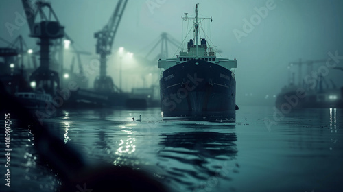 A large cargo ship anchored in a still harbor, surrounded by empty docks and idle cranes, visually symbolizing a port strike that has halted operations. The ship's deck, devoid of activity, underscore