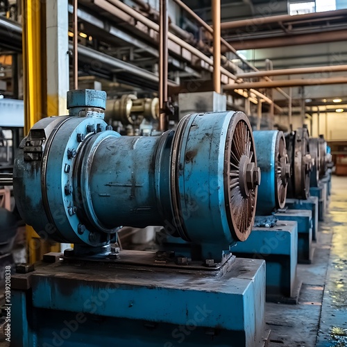 A large centrifugal water pump in operation, with a robust blue body, connected to steel piping running through the factory floor.