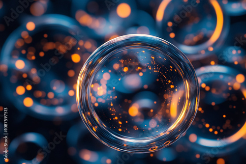 A large, clear orb dominates the foreground, glowing with internal orange sparks against a backdrop of blurry, blue-toned circles